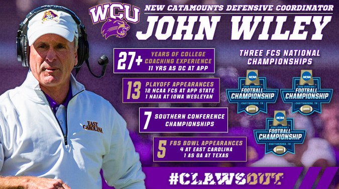 John Wiley has been named the next defensive coordinator at Western Carolina by head football coach, Mark Speir. Wiley has over 30 years of coaching experience at a variety of levels to the Catamount football program. Coach Speir worked with Wiley at App State from 2003-09.